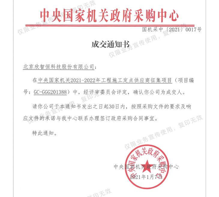 2021-01-22北京欣智恒科技股份有限公司在2021—2022年度公司順利入圍中央國家機(jī)關(guān)工程定點企業(yè)招標(biāo)項目(項目編號:GC-GGG201388)中,經(jīng)評標(biāo)委員會評定,確認(rèn)欣智恒公司為中標(biāo)人。特此通知。